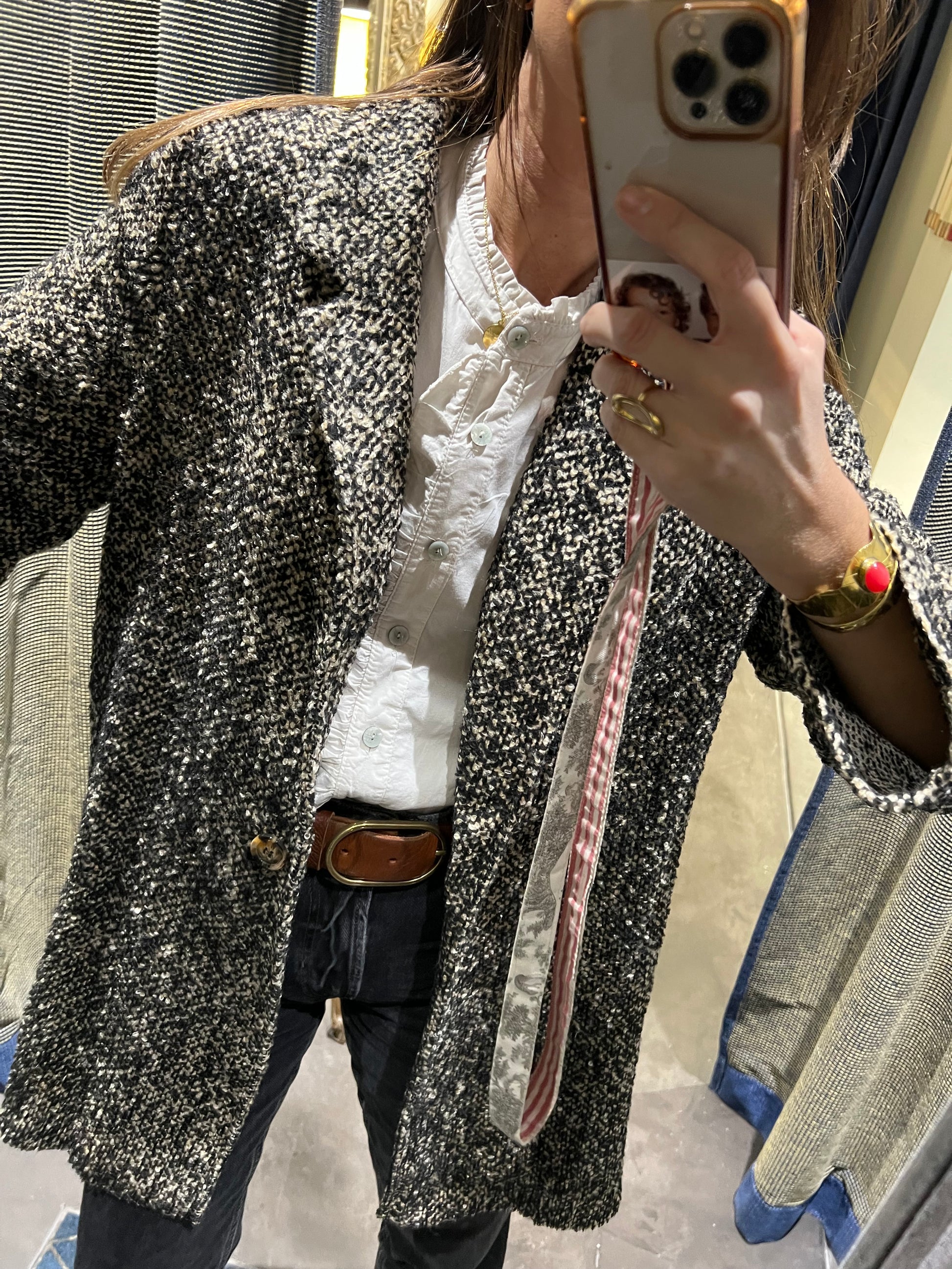 Abrigo moteado en tonos beige, negro y gris. Cierre mediante botones frontales. No lleva forro. Muy ligero y funcional.