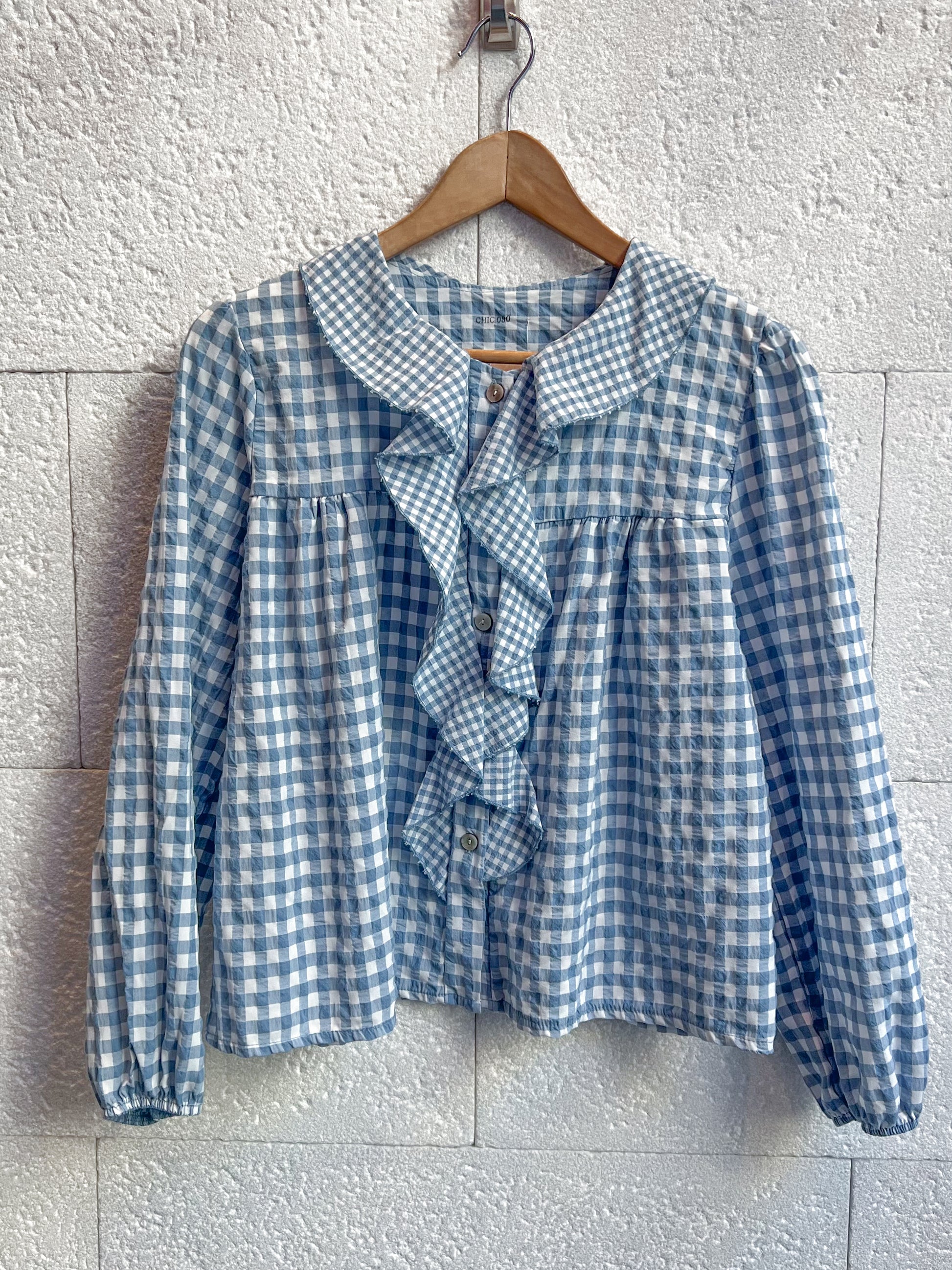 Camisa de cuadros vichy azul y blanca, con detalle de volante en la zona del escote. ¡Nos encanta la combinación de Vichy pequeño y grande!