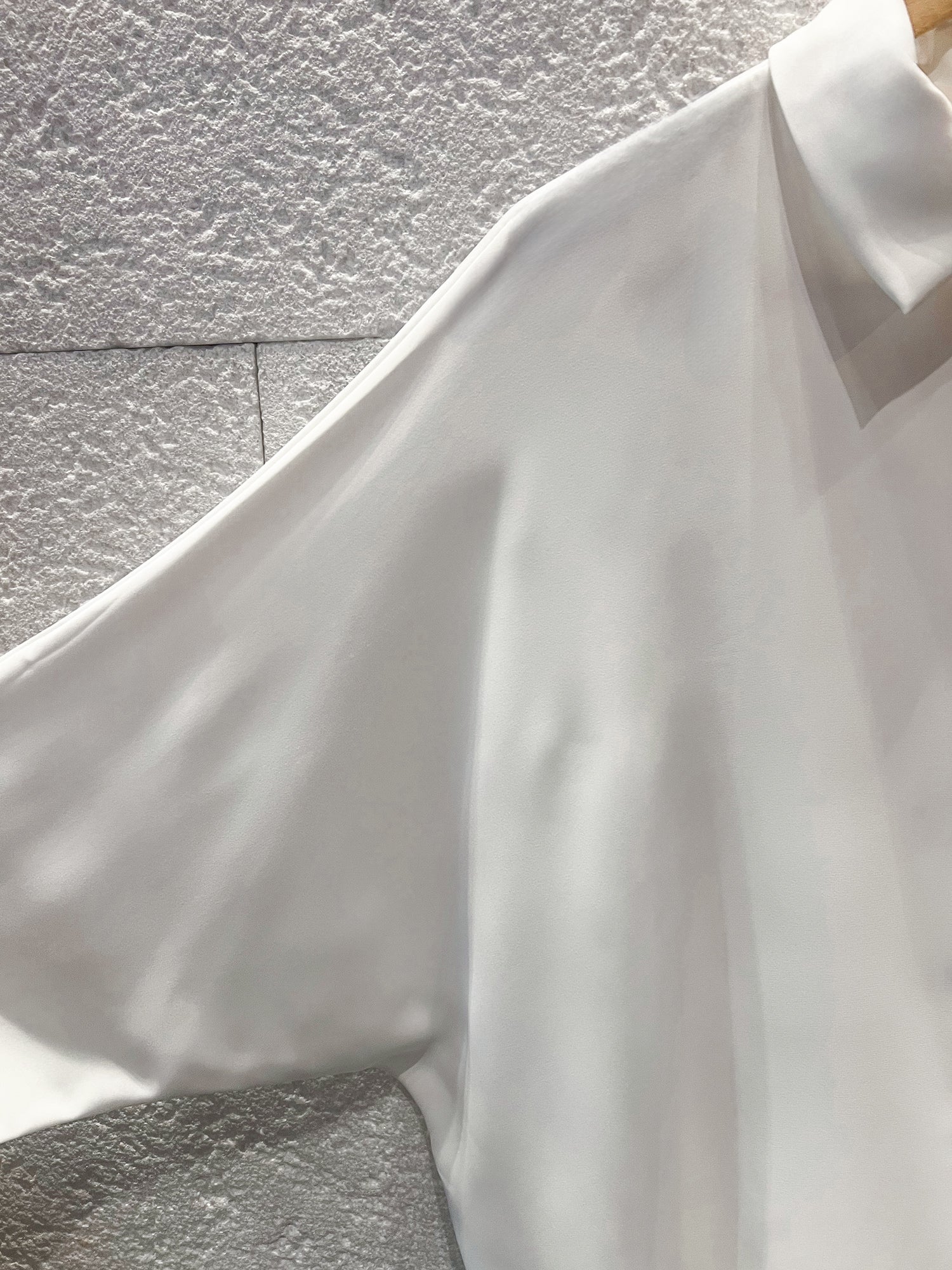 Camisa blanca oversize con mangas dolman, súper estilosa y favorecedora. Tiene una caída espectacular gracias a su tejido, tipo crepe sedoso.
