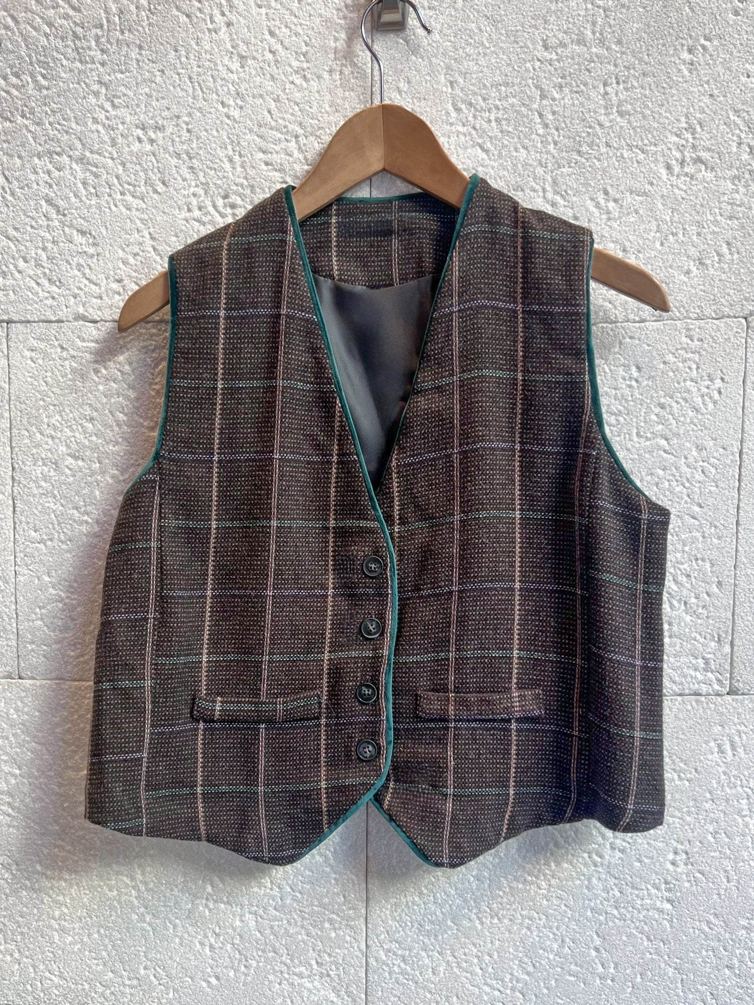 Chaleco con estampado de cuadro de gales y ribeteado en terciopelo. Va forrado.