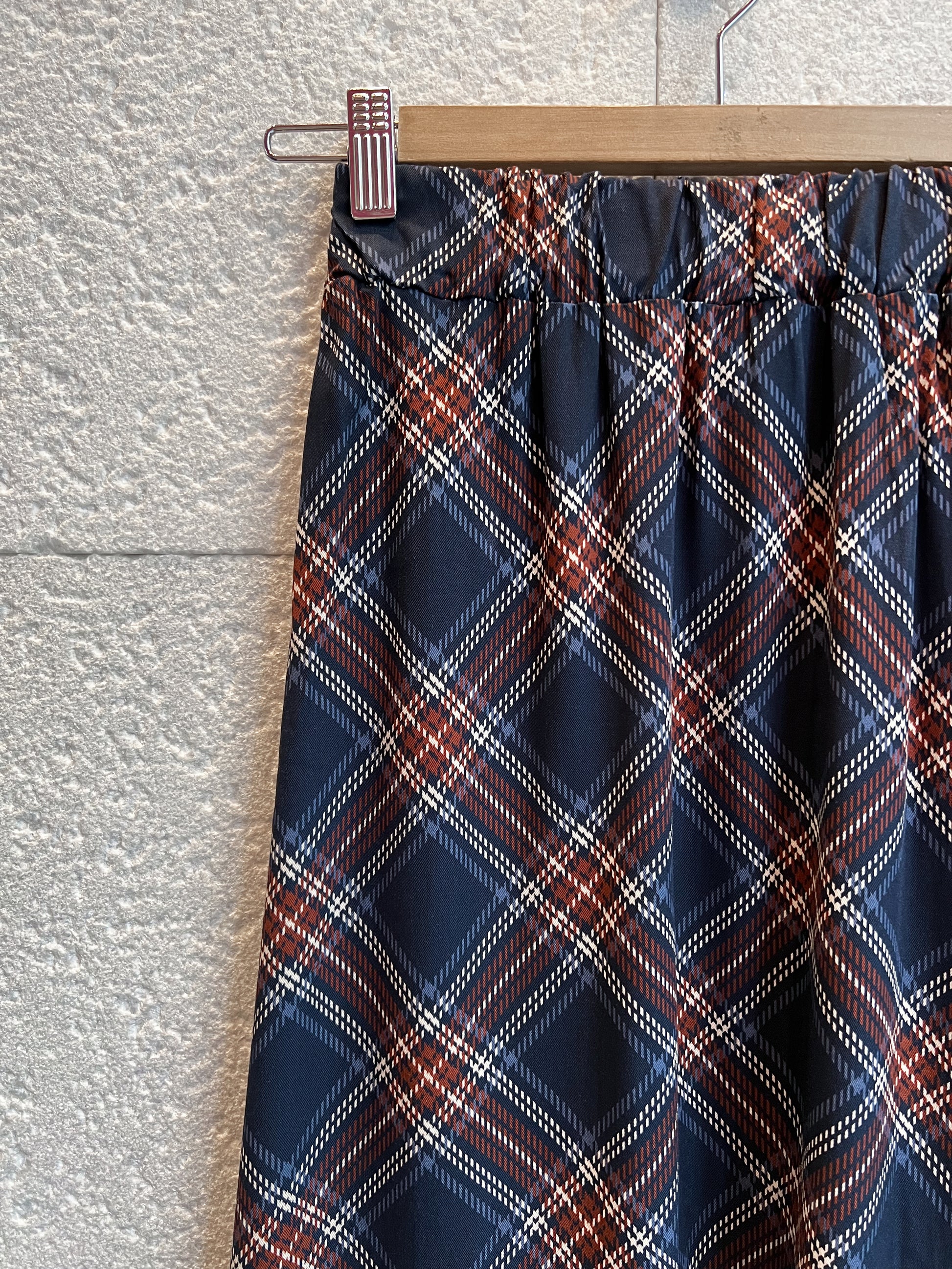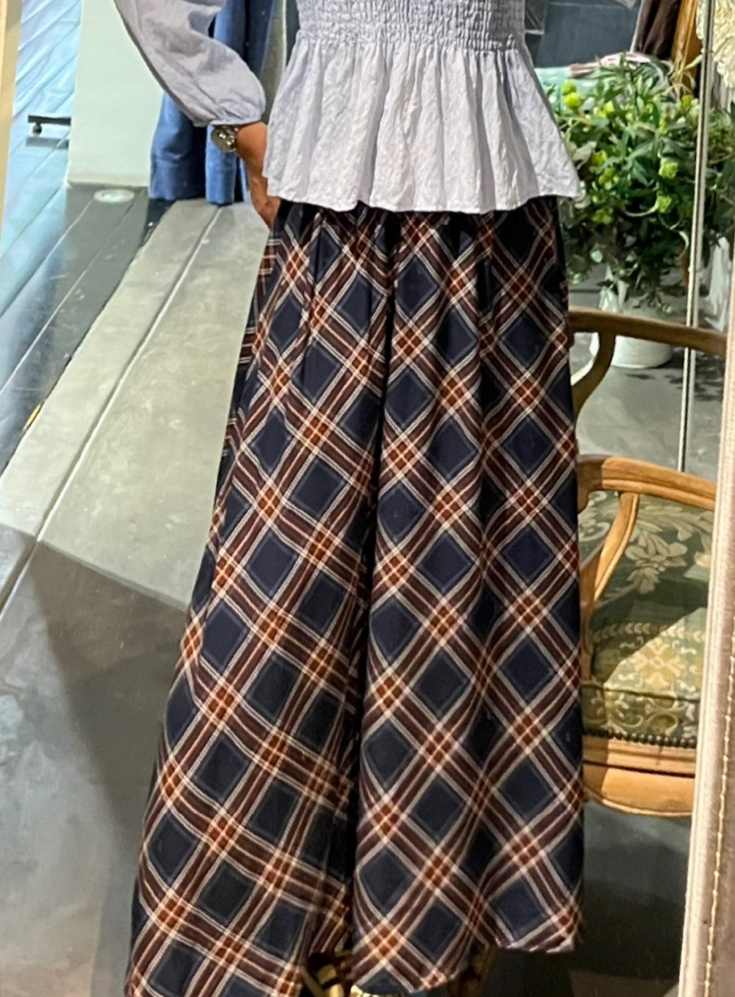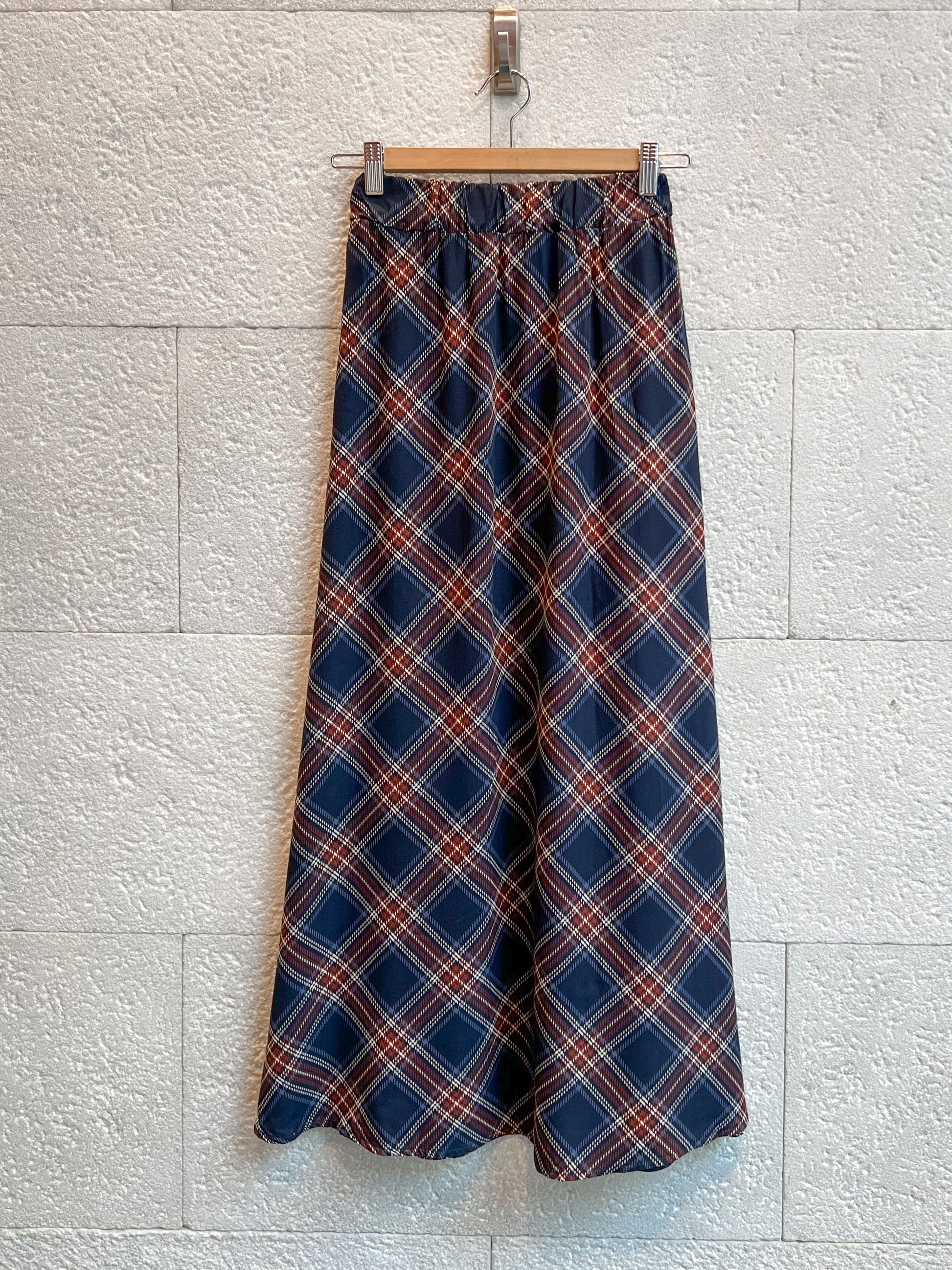 Falda de cuadros escoceses, con goma en la cintura, forma evasé.