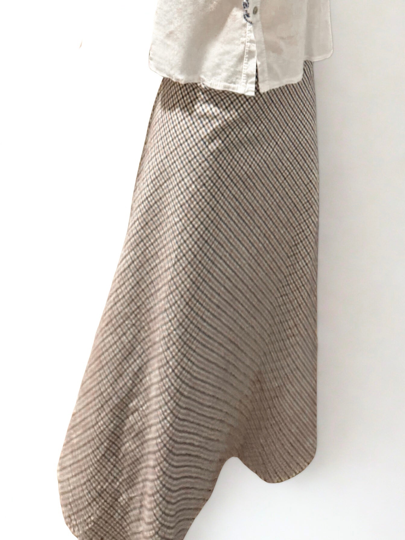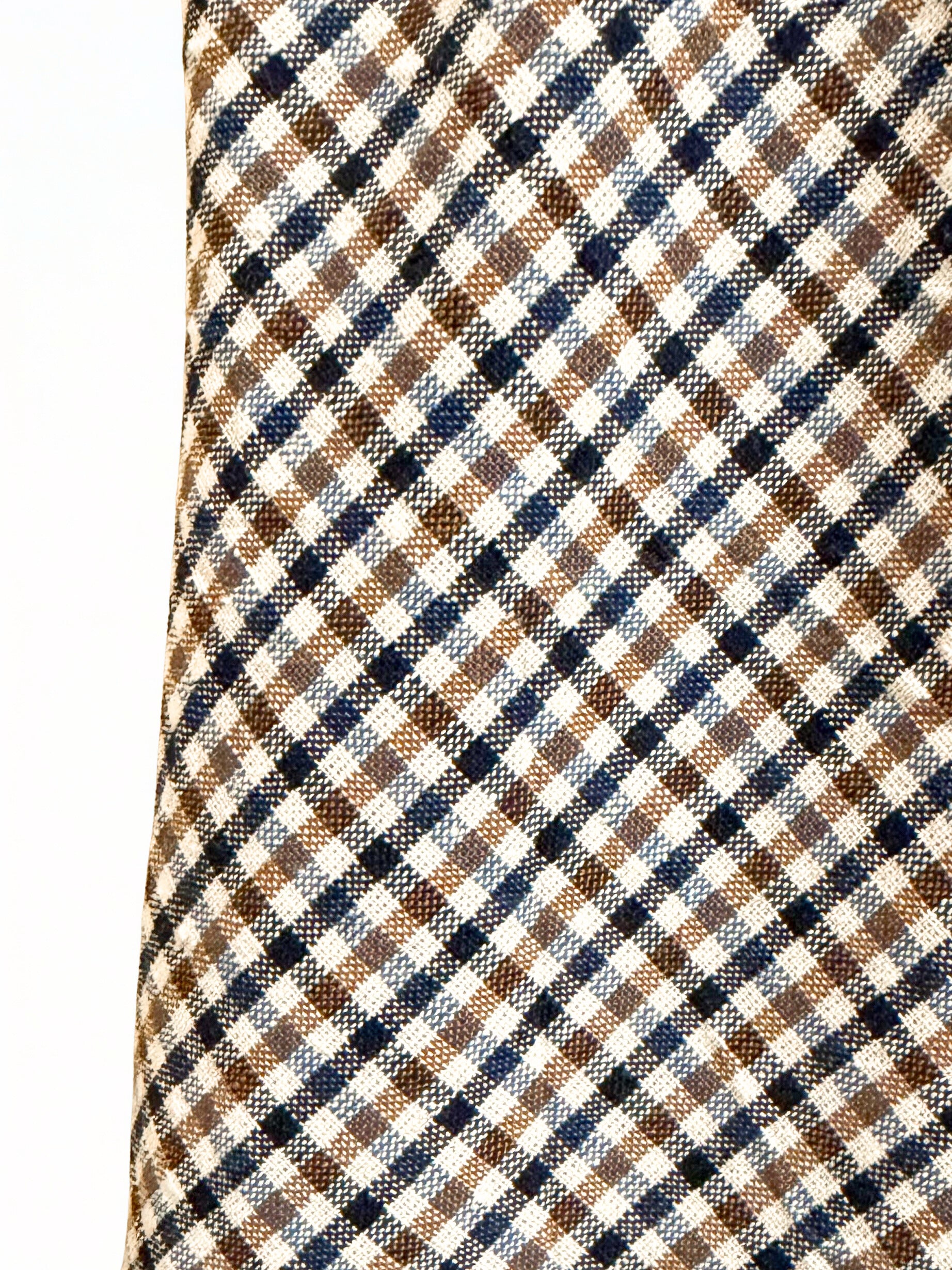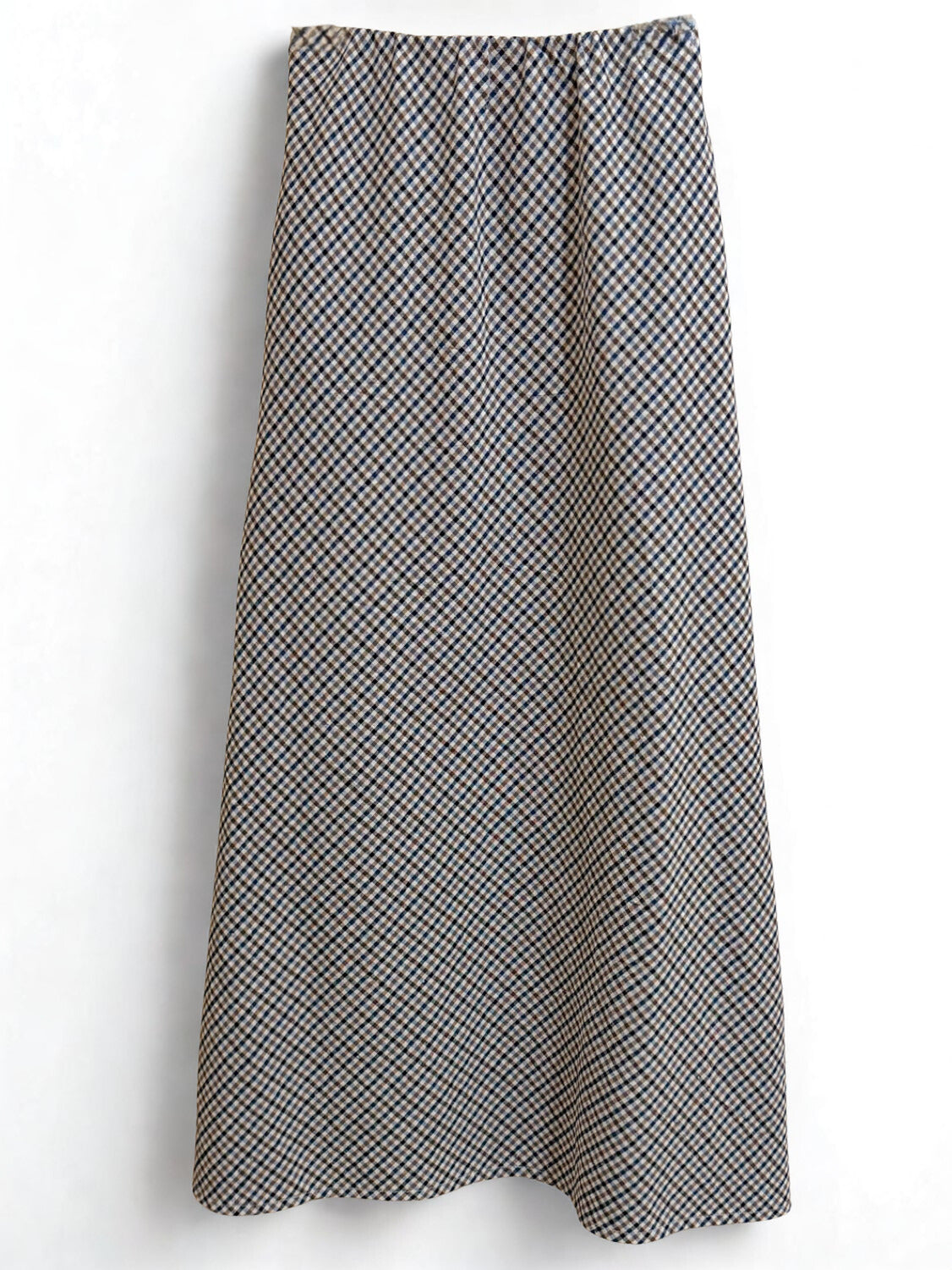 Falda con estampado de cuadritos en tonos crudo, azul y marrón, forma evasé. Goma en la cintura.