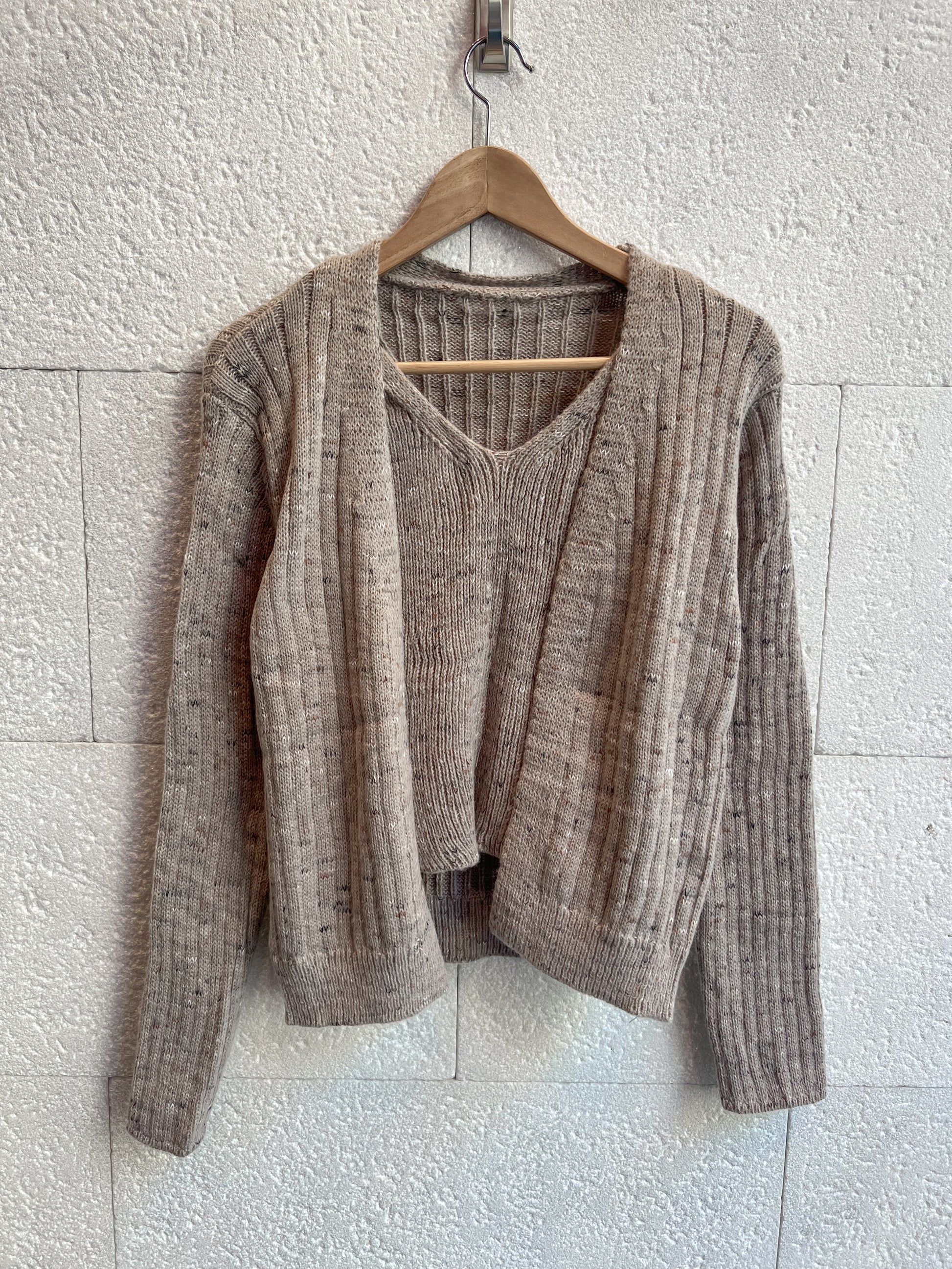 Conjunto Twin Set compuesto por crop top de punto de canalé y chaqueta abierta a juego. El top es de tirantes, cortito y queda ceñido al cuerpo. ¡Es ideal si eres talla “petite”!