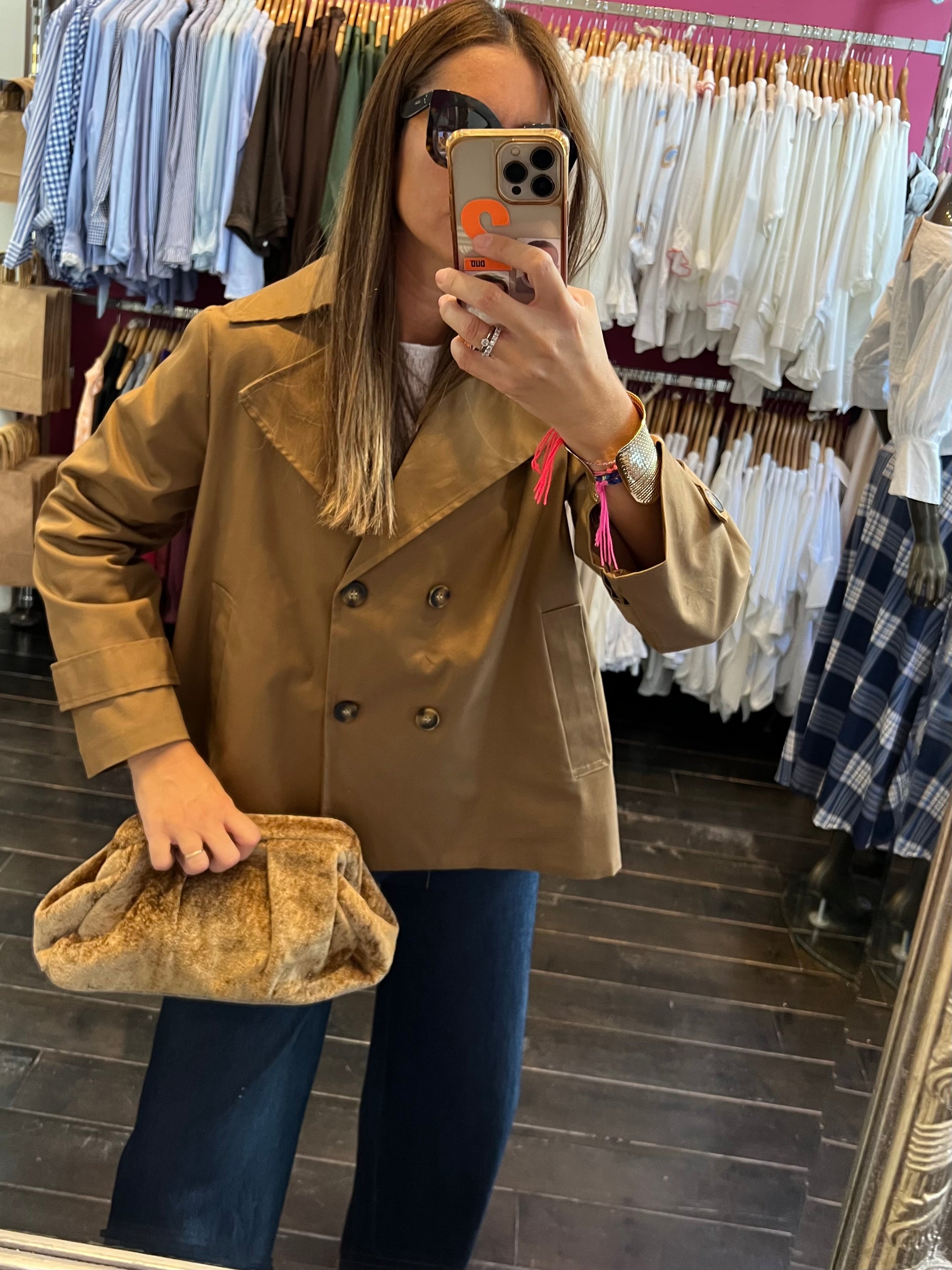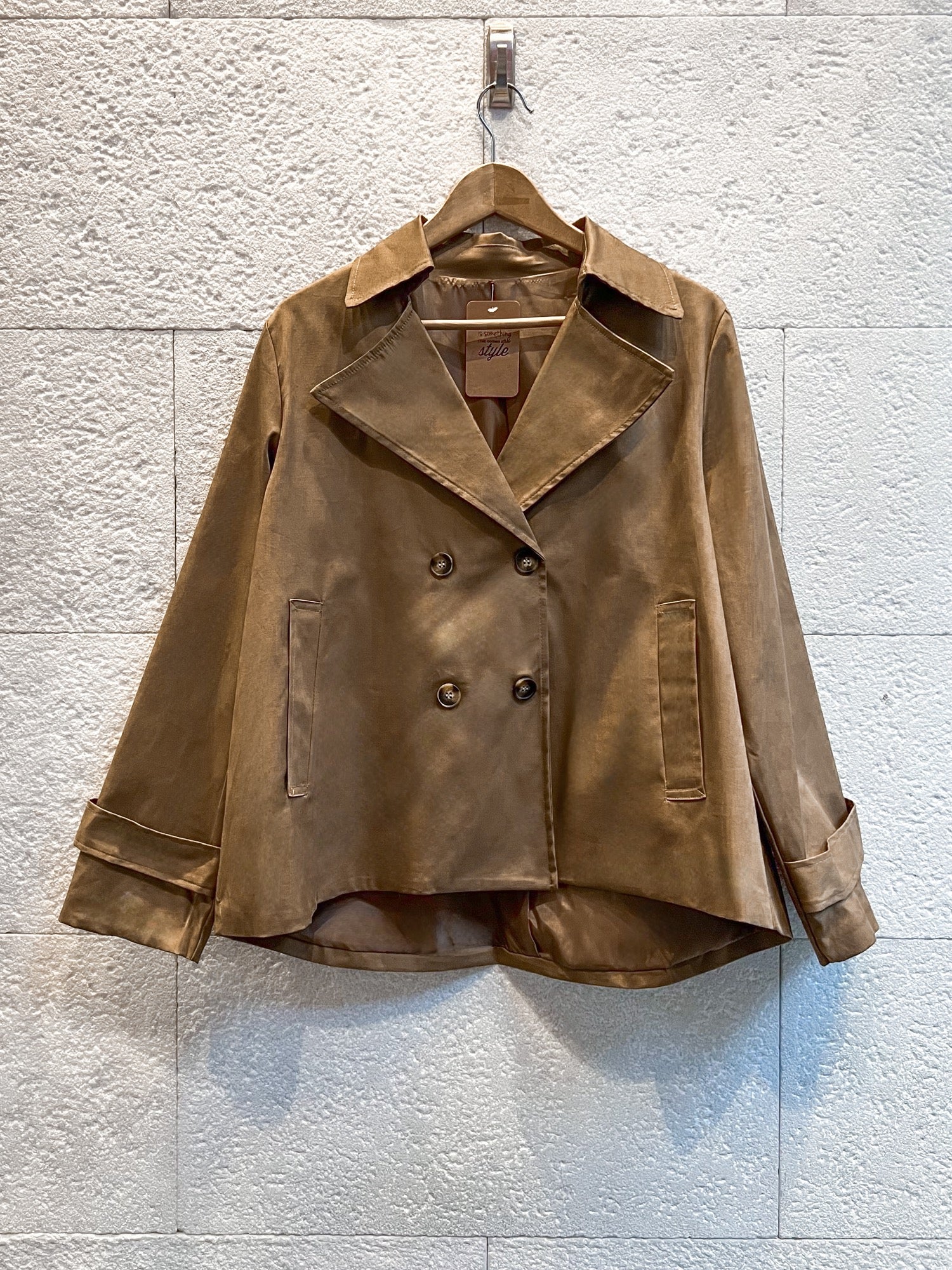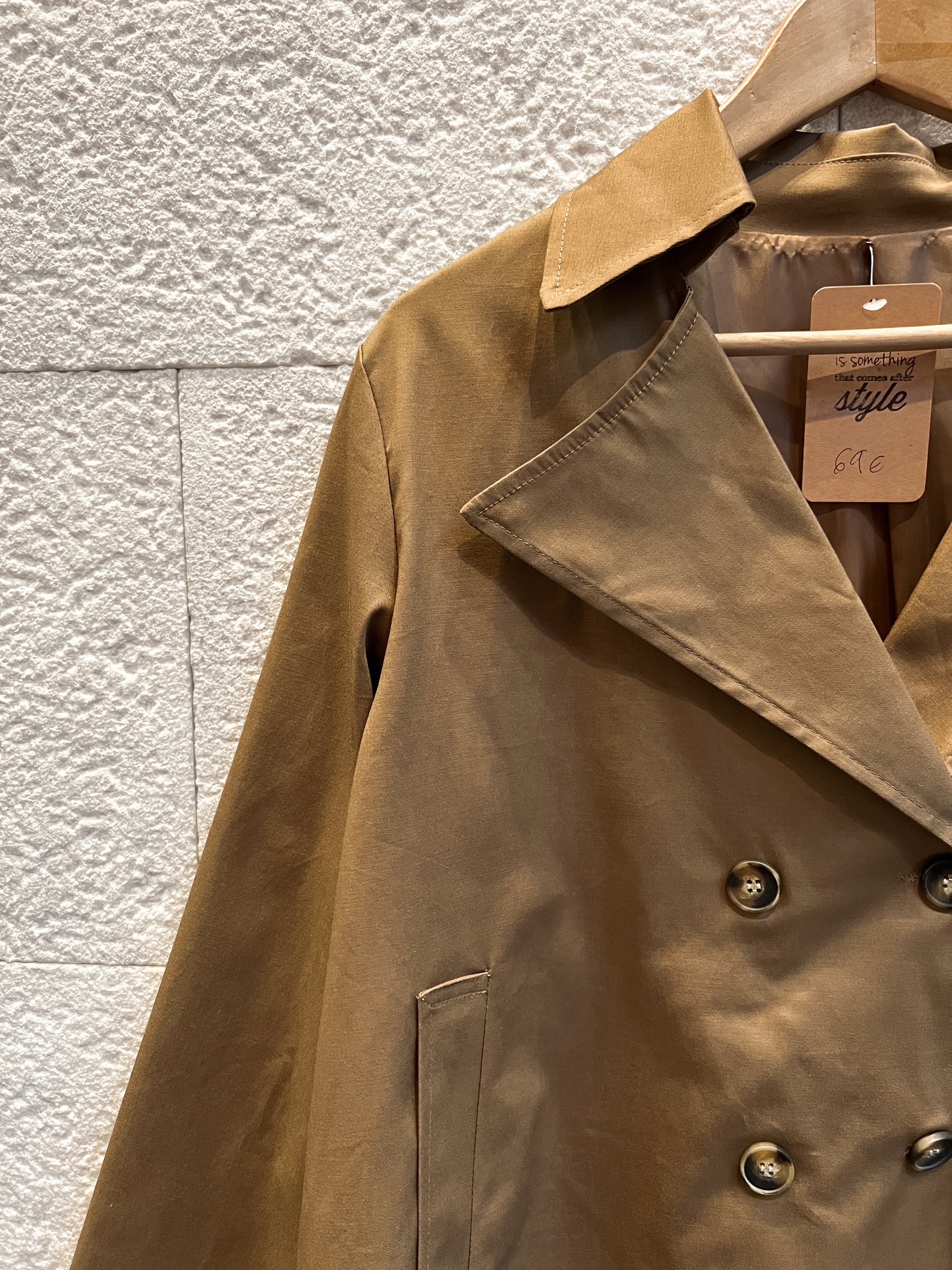 Trench a la cadera ligeramente más largo por detrás. Totalmente forrado. Bolsillos laterales. Corte en A.