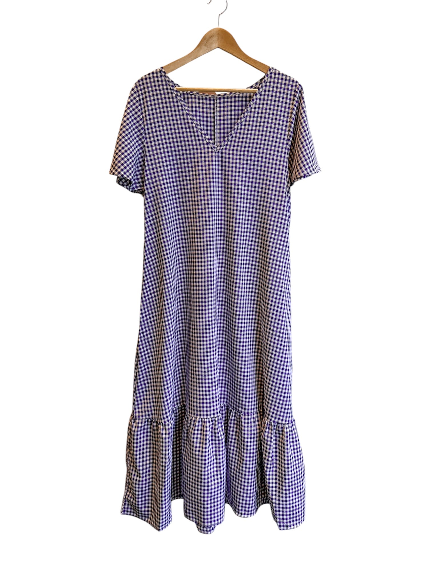 Vestido largo con estampado vichy. Manga corta, corte evasé y volante en la parte de abajo.